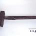 Description : Masse à tête carrée et incurvée concave dans le sens de la largeur. L'oeil est rectangulaire aux bords arrondis. Le talon est un marteau aux bords chanfreinés et au sommet martelé. Le manche est cylindrique et de coupe ovoïde. Le manche a été râpé à la tête. Manche équarri sur la moitié. Fendu, il est bagué à la base par un fil de fer. La tête du marteau est écrasée. Certains éléments composant la tête circulaire frangée se sont rompus.