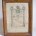 Description : Sous verre avec un cadre en bois. Un cartouche avec au sommet une tête de méduse et en dessous un médaillon avec la francisque encadrée des lettres F/M, puis une ancre avec un cuir sur lequel figure Honneur et Patrie. Sur les algues où s'entourent un ruban où sont inscrites les grandes batailles de la Marine dont le moulin de Laffoux. Ces algues soutiennent deux médaillons encadrés de dauphins, mentionnant "Anno 1914 et Anno 1918". Citation à l'ordre du bataillon Laurent Eugène, seconde maître fusilier n°59991 Toulon "Second maître très brave, s'est porté résolument à la tête de sa demi section à l'assaut des tranchées de moulin de Laffaux le 14 septembre 1918 où il a été grièvement blessé au bras gauche." signé C. Martet Capitaine de Frégate Ce document a été encadré dans l'année 1940, en témoigne un journal local de juillet 1940 collé au dos.