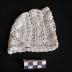 Description : Bonnet confectionné au crochet. Il est fait de points différents créant divers motifs ; lignes de crochet ajouré avec brides simples plus ou moins serrée, roues autour d'un anneau, festons, ananas, points noués formant bouton. Ne possède aucune attache pour le tenir.