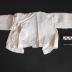Description : Vêtement taillé dans un tissu écru. Entièrement fait à la main. Le corps du vêtement est taillé en une seule pièce avec une couture sur les épaules et fendu au milieu du dos. Il possède deux manches de 15 cm de long sur 9 cm de large. L'encolure est bordée d'un petit ourlet, ainsi que les côtés et le bas du vêtement.