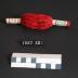 Description : Lacet plat de soie rouge replié en plusieurs tours, maintenu en place par deux étiquettes posées en forme de bague autour des deux extrémités. Une étiquette des galeries Lafayette est collée par-dessus l'une d'entre elles. Une correction à la main a été apportée sur les étiquettes. 20 mètres devient 25.