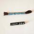 Description : Deux lacets noirs pliés en écheveau resserrés par une étiquette blanche et bleue et dorée. Les bouts des lacets sont serrés dans une petite gaine métallique.