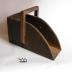 Description : Caisse en bois constituée d'une base horizontale rectangulaire : 46 x 17 cm. D'un fond vertical perpendiculaire à la base (17x 25 cm) deux flancs, verticaux, de forme rectangulaire terminée par un arc de cercle (46x25 cm). La caisse est munie d'une anse constituée de deux montants cloués sur les flancs de la caisse et soutenant la poignée.