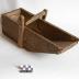 Description : Caisse en bois constituée d'une base horizontale rectangulaire : 37 x 21 cm. D'un dos vertical perpendiculaire à la base (21x 13,5 cm), de deux flancs perpendiculaires cloués sur le fond (27,5 x 13,5 cm). Les extrémités opposées au dos sont arrondies. Un bout de bois est cloué à l'extrémité de la base opposée au fond vertical. C'est un arrêtoir. La caisse est munie d'une anse : Deux montants verticaux cloués aux flancs et une poignée en bois taillée pour lui donner une forme approximativement arrondie.