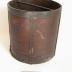 Description : Double décalitre en bois déroulé, de forme cylindrique à fond légèrement bombé. Il est renforcé à la base par un cercle en bois déroulé et au sommet par un cercle métallique riveté. Cinq bandes de métal rivetées, disposées en étoiles en partant du fond, renforcent verticalement le récipient. Un renfort intérieur en T est également présent.