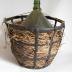 Description : Ensemble constitué d'une bonbonne en vert teinté vert foncé entourée de paille et placée dans un berceau. Le berceau est constitué de feuillards assemblés pour obtenir un receptacle à claire voie dont la base est circulaire et plane. Trois cercles horizontaux relient tous les montants également répartis sur le pourtour. La bonbonne est posée au centre et l'espace entre le berceau et la bonbonne est bourrée de paille. La bonbonne est liée en place par de la corde et du fil de fer.
