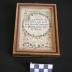 Description : Image portant une pensée. La première lettre est enluminée. Une couronne de fleurs dessinées en vert et rouge entoure la pensée. Le cadre comporte plusieurs moulures grenat et dorées. Un piton en forme d'anneau est fixé dessus pour la suspension.