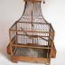 le dessus de la cage est fait de barreaux en fil de fer qui se rejoignent en s'incurvant autour d'une plaque de bois de 13x9 cm, sur le dessus un anneau et fil de fer en forme de crochet pour la suspension ; aux angles des crochets avec des pendentifs constitués de petits blocs de bois. La cage possède une porte en barreaux sur une de ses faces. Sur le fond de la cage une plaque de propreté coulisse vers l'extérieur. Deux perchoirs horizontaux à l'intérieur de la cage et un balancier en forme de croix de Lorraine. un bac en verre sert de réservoir à eau pour permettre aux oiseaux de boire.