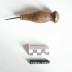 Description : Outil de cordonnier formé d'une tige d'acier pointue et courbe à son extrémité, montée sur une poignée en bois tourné et ouvragé. (L du manche : 13 cm).