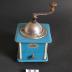 Description : Corps en bois peint en bleu, angles en blanc, contenant dans la partie supérieure le mécanisme de broyage du café et dans la partie inférieure le tiroir pour recueillir le café moulu (le tiroir est amovible et muni d'un bouton métallique de préhension).