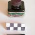 Description : Récipient en verre transparent sur plan rectangulaire à bords de faible hauteur (3 cm) muni d'une tubulure en verre centrée sur la face supérieure, hauteur de la tubulure 2 cm. La tubulure est filetée pour recevoir le bouchon diamètre 2 cm. L'encrier contient de l'encre violette et un dépôt. Le bouchon est de couleur violette.