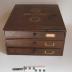 3 tiroirs superposés coulissent dans le sens de la longueur, celui du haut est divisé en 10 casiers délimités par des bandes de carton entrecroisées, les 2 autres tiroirs possèdent 15 casiers recouverts d'une feuille de celluloïd portant toutes les deux les mentions Cartier Bresson C. B. couleurs solides