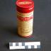 peinte en rouge avec étiquettes jaunes, celles-ci donnent les indications d'emploi, la posologie, la formule, etc..
