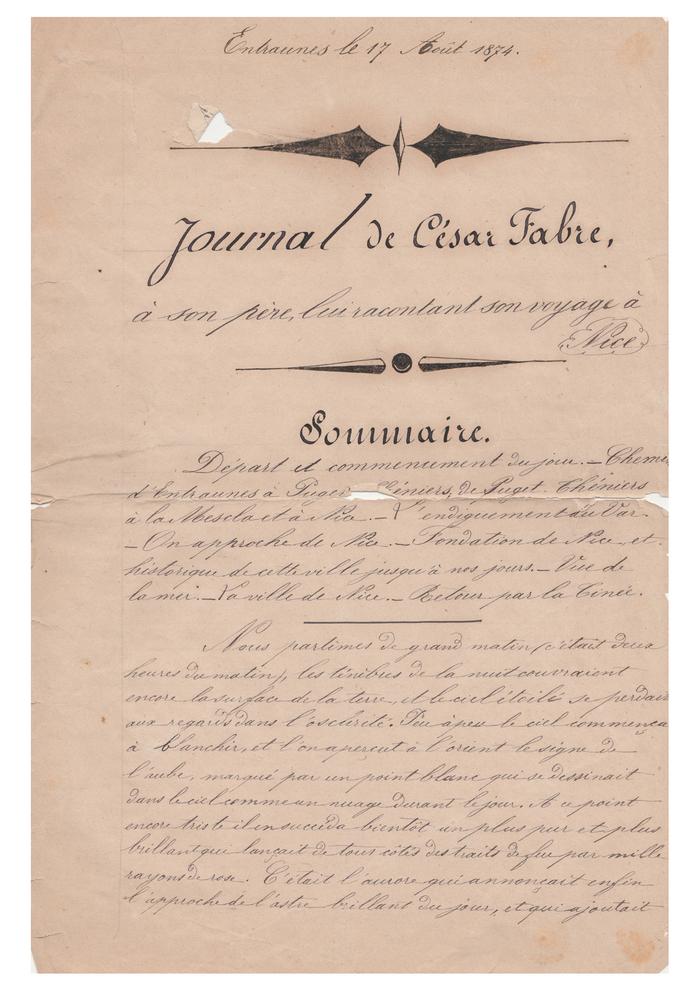 Description : César Fabre âgé de 16 ans , écrit pour son père Angelin Fabre meunier d'Entraunes, le journal de son voyage le long du fleuve Var jusqu'à Nice . Il y décrit toutes les émotions d'un jeune montagnard découvrant "le monde" pour la 1ère fois.