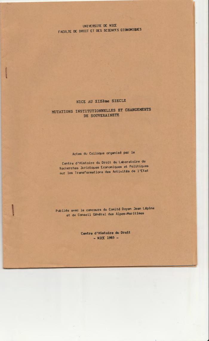 Actes du colloque Nice au XIXè, Mutations institutionnelles et changements de souveraineté organisé par le Centre d’histoire du droit du laboratoire de recherches Juridiques Economiques et politiques sur les transformations des activités de l’Etat