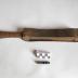 Description : Un support en bois comprenant un manche de 14 cm mouluré à section circulaire de diamètre variable (2,5 à 3 cm) prolongé par une planchette (19x4 cm) terminée à chaque extrémité par un cube d'un côté et une demi-sphère de l'autre. La bande de cuir est clouée sur le cube et contourne la demi-sphère.