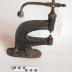 Description : Corps en fonte verni noir filet rouge. Il a la forme de la lettre C et est terminé par une semelle ovale renforcée. Celle-ci se visse sur un plan de travail par 3 vis. La partie supérieure du C est terminée par le logement du levier de manoeuvre qui est une tige cylindrique (D : 1,4 cm), Cette tige est reliée à la matrice supérieure de l'outil. Elle est horizontale avec une partie aplatie pour le raccordement à la tige de descente de l'outiL Son extrémité est recourbée et se termine par une boule. On fait descendre la matrice supérieure en faisant tourner la manivelle d'un quart de tour. La remontée est automatique. La matrice inférieure de l'outil fait partie du bâti. La mâchoire inférieure est maintenue par une vis qui traverse le bâti. La supérieure se visse dans le bâti.