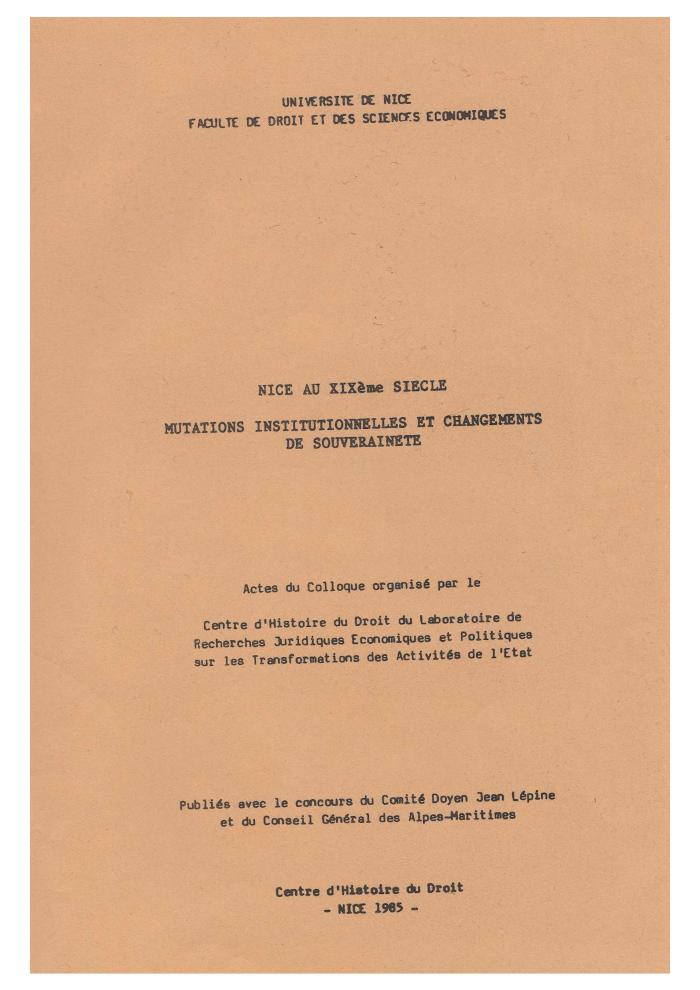 Description : Actes du colloque Nice au XIXe, Mutations institutionnelles et changements de souveraineté organisé par le Centre d’histoire du droit du laboratoire de recherches Juridiques Economiques et politiques sur les transformations des activités de l’Etat.