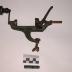 Description : Bâti en acier de couleur verte en forme de parenthèse. Il est muni d'un pied en forme de C. Ce pied permet de fixer le bâti sur une table. Quand il est fixé à la table, le bâti est horizontal. La fixation se fait par une tige filetée terminée à l'extrémité extérieure par un papillon de préhension et à l'autre extrémité par une rondelle conique libre. Une des extrémités du bâti porte une manivelle ave une poignée profilée en bois, elle entraîne un lissoir circulaire en acier. A l'autre extrémité du bâti une tige coulisse dans deux anneaux, elle est actionnée par un levier fixé au bâti. A l'extrémité de la tige, un logement; (D extérieur 3 cm, H : 1,2 cm) permet d'y enfoncer la cartouche pour la bourrer.