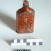 Description : Flacon en métal peint en orange à section ovale à bords droits, goulot de 1 cm de hauteur muni d'un bouchon en liège dans lequel passe un bout de lacet rouge.