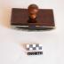 2002_445-2 : plaque de bois trouée en son centre, vernie d'un côté et les bords sont chanfreinés. Elle se place au dessus de la pièce n° 1en s'enfilant sur la vie.