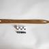 Description : Planchette en bois découpée à la scie sauteuse. A une extrémité, une découpe rectangulaire centrée de 1,6 cm de longueur sur 1,3 cm de largeur. L'autre extrémité est découpé de façon à lui donner la forme d'une pointe. Une découpe à la scie crée une fenêtre qui épouse la forme effilée de la pointe.