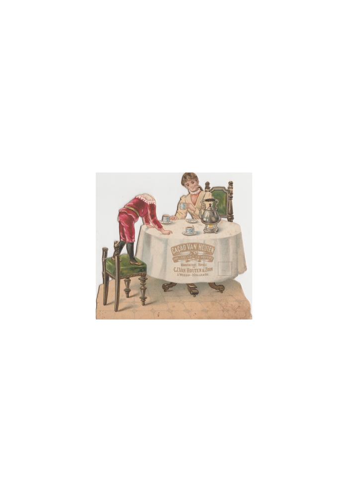 Description : Gravure industrielle imprimée en chromolithographie, figure sur support cartonné, au format carte à découper. Chromo-réclame * pour la marque Cacao Van-Houten.