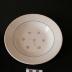 Description : Récipient sur plan circulaire (D : 10,5 cm à la base) à bords galbées et très évasés. Le marli est souligné d'un trait bleu. Six petits groupes de roses bleues sont régulièrement répartis sur l'assiette en forme de polygone à 5 côtés et un au centre.
