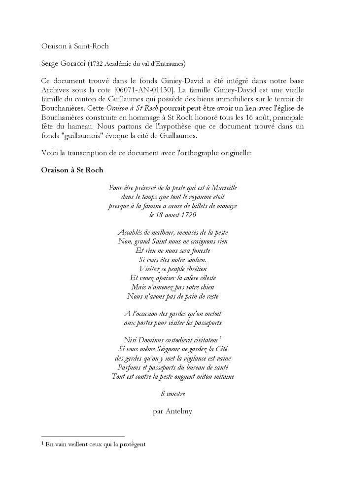 Description : Ce petit document intitulé Oraison à St Roch a été trouvé dans le fonds Giniey-David. La famille Giniey-David est une vieille famille du canton de Guillaumes qui possède des biens immobiliers sur le terroir de Bouchanières. Cette Oraison à St Roch pourrait peut-être avoir un lien avec l'église de Bouchanières construite en hommage à St Roch honoré tous les 16 août, principale fête du hameau. Nous partons de l'hypothèse que ce document trouvé dans un fonds "guillaumois" évoque aussi la cité de Guillaumes. L'auteur y fait allusion à la peste de Marseille en 1720 et à la faillite du système de Law et leurs conséquences.