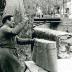 Jean Ros fabriquant un bât : La paille remplissant les coussinets est tassée au moyen d'une planche.