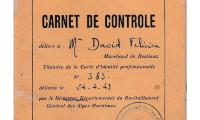 Description : Carnet de contrôle du ministère du ravitaillement délivré à David Félicien, marchand de bestiaux à Guillaumes, titulaire de la carte d'identité professionnelle n° 383 délivrée le 24/4/1943 par le Directeur départemental du Ravitaillement Général des Alpes-Maritimes.