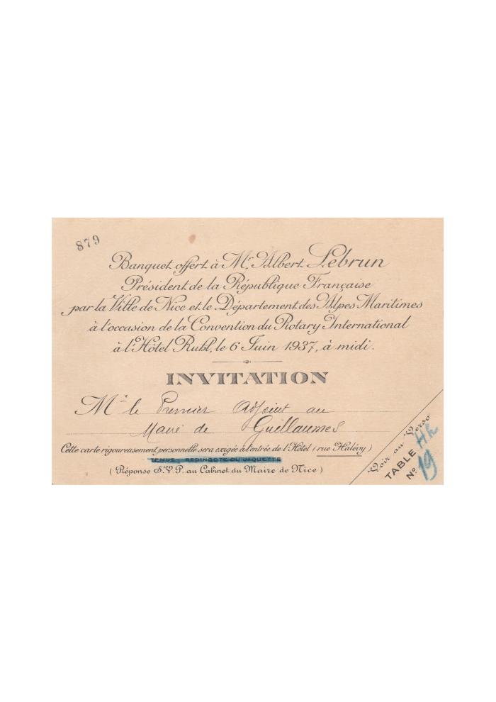 Description : Carton d'invitation envoyé à David Félicien, ,1er adjoint du Maire de Guillaumes le Docteur Julien Agnely* , pour participer au banquet offert à Monsieur Albert Lebrun , Président de la République Française** par le Maire de la Ville de Nice Mr Jean Médecin et par le Département des Alpes-Maritimes présidé à l'époque par Léon Baréty.*** , banquet donné à l'occasion de la convention du Rotary International à l'hôtel Ruhl de Nice.