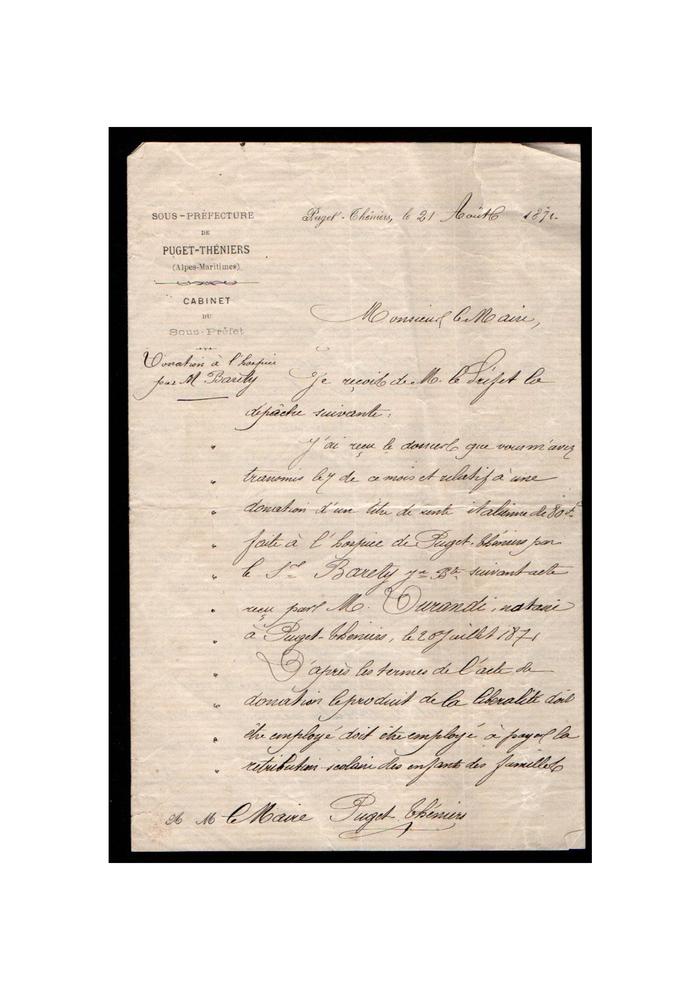 Description : Le Sous-Préfet Tony Touchebœuf 1 accuse réception du dossier relatif à une donation d'un titre de rente italienne de 80 francs faites à l'hospice civil de Puget-Théniers par le sieur Jean-Baptiste Barety qui a précisé dans l'acte fait devant le notaire Durandy Joseph de Puget-Théniers que ce don doit être employé à payer la rétribution scolaire des enfants des familles indigentes de la commune et à concourir au traitement des deux instituteurs de l'école des garçons à la condition expresse qu'ils soient choisis parmi les membres de la Congrégation 2. Dans le cas contraire la rente serait affectée aux dépenses de l'hospice.