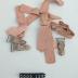 Description : La jaretelle est composée d'une pince dont une des branches est en caoutchouc avec un picot en forme de rivet, l'autre branche est métallique. Elle possède un logement s'emboîtant sur le picot pour assurer la fermeture et un passant rectangulaire. La pince est recouverte d'un ruban rose de camouflage. Dans le passant est introduit un ruban élastique (L : 16 cm Lg : 2 c) qui forme la jaretelle. Le réglage est assuré par des boutonnières réparties le long de ce ruban.