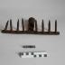 Description : Lame en "T". La barre du "T" (27x2 cm) est percée de 9 trous qui reçoivent des clous de section losangique (L : 7 cm). Ces clous sont fixes. Le montant de la barre (L : 9 cm) est recourbée de façon à forme une douille destinée à reçevoir le manche.