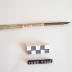 Description : Manche imitant l'ivoire avec fenêtre de vision ronde type "souvenir". Par les fenêtres apparaissaient des vues imprimées dans du verre. La moitié du manche est plate et large (1 cm) se terminant par une pointe, l'autre moitié est travaillée cylindrique et surmontée d'une autre partie cylindrique en fer dans laquelle est insérée une plume d'acier.