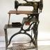 Description : Machine à coudre sur pied en métal avec pédalier sur entretoise métallique. Volant émaillé et guide courroie, courroie en caoutchouc, bielle métallique, navette rotative. Le pied de biche se soulève et fait un mouvement de va et vient latérale. Ressort de tension de fil, pignon d'emplacement de bobine. Table en bois (46x29 cm) amovible soutenue par un pied en bois. Un tiroir en bois (11x21 cm°. Système de recherche de la canette. Deux roulettes sur deux pieds. Décoration dorée avec un filet rouge.