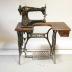 Description : Machine à coudre sur pied en métal avec pédalier sur entretoise métallique. Petit volant émaillé D : 15 cm. Système de recharge de canette à vis circuliare, vis de réglage de longueru des pointes, guide , courroie en caoutchouc. Deux pignons d'emplacement de bobine de fil. Un tiroir en bois (15 x40 cm). La table de travail rectangulaire est échancrée (48x90 cm) pour permettre le passage des objets à coudre. Sous la tablle, une manette entraîne par un système de levier un pied de biche. Décoration dorée sur la machine.
