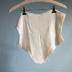 Description : Culotte de femme sans jambes, tricotée à la main avec un coton fin et brillant. On remarque deux coutures sur le côté, une couture sur l'entrejambe. La taille n'est pas finie. Il reste à coudre l'ourlet qui permet de laisser passer un élastique de maintien. Devant et dos sont identiques. Evasée sur les hanches.