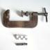 Description : Outil ayant la forme d'un "U" réalisé par une tôle d'acier de forte épaisseur (1,5 à 0,7 cm) ayant une section trapézoïdale , mise sur champs. Une des branches du U se termine par un évasement pour avoir une surface plane quasi-circulaire (D : 4 cm), l'autre se termine par un pas de vis (H : 7,5 cm D int : 1,2 cm D ext : 2,4 cm. Dans le pas de vis passe une tige filetée de 10 cm dont l'extrémité extérieure en "U" est terminée par une tige perpendiculaire servant de clé de manoeuvre. Pour visser ou dévisser la tige. L'autre extrémité est terminée par deux écrous hexagonaux et une plaque ronde mobile (D : 3,5 cm) servant de machoîre inférieure à la griffe.