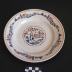 Description : Récipient individuel sur plan circulaire, à bords bas inclinés, marli avec un pied annulaire. Le bord est garni d'une ligne continue brune suivant le bord de l'assiette, dessin ondulé continu composé d'un petit paysage stylisé avec maison aux toits bruns. Les arbres et le contour des maisons sont bleus. Le centre de l'assiette comprend un cercle en pointillé (D : 8 cm) entourant un paysage représentant un village stylisé (église, quelques maisons, croix du cimetière, un arbre.