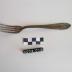 Description : fourchette à quatre dents écartées en éventail. Avec une décoration en relief (ligne) sur les deux faces du manche.
