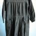 Description : Vêtement d'écolier en coton noir, à bras séparés : manches longues (L : 40 cm, Lg au poignet 8 cm) étrécies au poignet, à col rond (D fermé 18,5 cm) ; se boutonnant par l'arrière, lequel est fendu sur toute sa hauteur en deux pans. La partie sup. du pan gauche comporte deux boutons ronds en bakélite noire (D 1 cm), le bouton sup. manque. A l'avant se trouve une partie centrale en plis lamés verticaux ; de chaque côté, une poche rectangulaire (12,5 x 11,5 cm) ; à mi-hauteur, une ceinture en coton noir (L : 105 cm, Lg : 3,5 cm), sans passants car cousue au niveau des plis verticaux. Evasement au bas : 58 cm de long.
