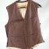 Description : Gilet sans manche (orifice circulaire D : 18,5 cm), ouvert en deux pans à l'avant, en coton épais, gris-brun avec des rayures verticales rouges et bleues (couleur atténuée) , présentant sur chaque pan deux poches, qui sont symétriques latéralement : poches (Lg : 8,5 cm Pf 8,5 cm) et poches bas (Lg : 11,5 cm Pf 7,5 cm). Le pan gauche présente cinq boutons ronds en écaille brune (D : 1,4 cm), le pan droit cinq boutonnières. Le dos, en velous gris-brun à côtes plates, présente au bas un ruban de serrage en deux parties, cousu, dont seules les extrémités intérieures sont libres (Lg maxi : 3,7 cm, mini 2,3 cm, L d'un tronçon 23,5 cm). En bas, au milieu s'ouvre une échancrure triangulaire, base vers le bas (L base 6 cm, H : 4,3 cm, l'intérieur du gilet est en doublure couleur crème, avec rayures bleues et noires.