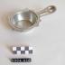 Description : Coupe cylindrique (Ht : 3 cm D inf. 5,5 cm) percée de petits trous, D sup. 7 cm entouré d'une colerette emboutie se prolongeant par une queue (6x3 cm) et percée d'un trou de suspension.