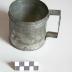 Description : Récipient à base circulaire bords droits, base emboutie et poinçonnée. Une poignée rectangulaire (Ht : 6,5 cm lg : 2 cm)