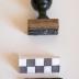 Description : Planchette de bois épaisse de 1,3 cm sur laquelle est fixée deux lignes de lettres en caoutchouc " RENE ROBION Puget-Théniers", surmonté d'une poignée en bois noire avec dessus un clou repère d'orientation des lettres.
