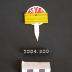 Description : Disque blanc (D: 4 cm) portant les inscriptions en rouge, pivotant sur un cadre rectangulaire jaune et ondulé (4,5 cm x 2 cm). Entre les deux, fixé sur le même axe, une tige de 5x1 cm pointue à la base pour être enfoncée dans un objet mou. Le cache servait aussi à recevoir l'étiquette des prix.
