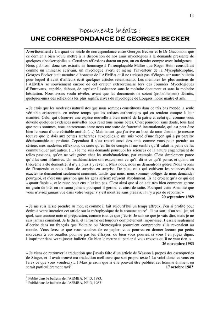Un quart de siècle de correspondance entre Georges Becker 1 et le Dr Giacomoni que ce dernier a bien voulu mettre à la disposition de nos amis mycologues à la demande pressante de quelques « beckerophiles ». Certaines réflexions datent un peu, on en tiendra compte avec indulgence. Nous publions donc ces extraits en hommage à l’irremplaçable Maître que Roger Heim 2 considérait comme un immense écrivain, un mycologue averti et même l’inventeur de la Mycophilosophie. Georges Becker était membre d’honneur de l’AEMBA et il ne tarissait pas d’éloges sur notre bulletin pour lequel il avait d’ailleurs écrit quelques articles retentissants. Les membres les plus anciens de l’AEMBA se souviennent encore de cet orateur extraordinaire lors des Journées Mycologiques d’Entrevaux, capable, debout, de captiver l’assistance sans le moindre document et sans la moindre hésitation. Nous avons voulu révéler, avant que les documents ne soient (probablement) détruits, quelques-unes des réflexions les plus significatives du mycologue de Lougres, notre maître et ami.