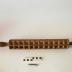 Description : Cylindre de bois ajouré, constitué d'une partie centrale en hêtre taillé, perpendiculairement à la longueur, de façon à présenter 13 Disque (diam. 6 cm, largeur 0,5 cm), parallèles et équidistants (écartement : 2,3 cm), pourvus chacun de 6 encoches régulièrement réparties sur leur pourtour. Dans ces encoches sont fixées, parallèlement à la longueur du rouleau, 6 baguettes de sapin (34 cm x 0,7 cm x 0,5 cm) le tout délimité par 6 rangées de 12 alvéoles. Chaque extrémité du rouleau se termine par un élément de préhension ovoïde (diam. maximum : 2,8 cm ; longueur : 7,5 cm).